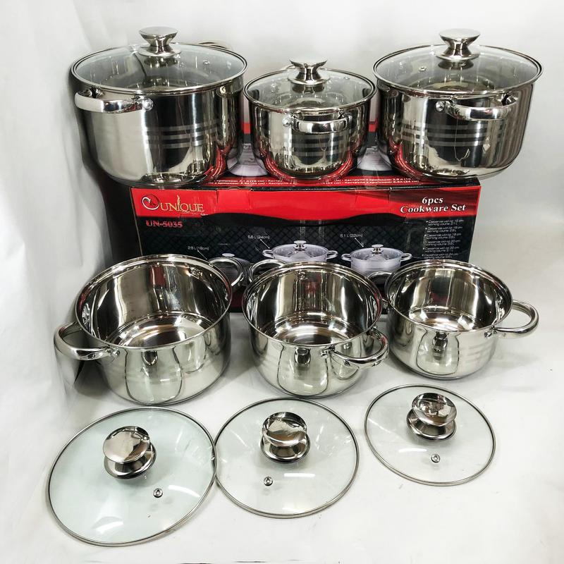 Набор посуды Unique UN-5035 Высококачественный набор посуды из нержавеющей стали с 5-ти слойным термоаккумулирующим дном, обеспечивает быстрый и равномерный нагрев по всему основанию, а также сохранение тепла в течении длительного времени. Совместим со всеми видами плит, включая индукционные. Термостойкие не нагревающиеся клепаные ручки. Крышки выполнены из жаропрочного стекла с отверстием для выхода пара.Кастрюли легко моются и чистятся. Подходят для мытья в посудомоечной машине и хранения в холодильнике. Привлекательный и практичный дизайн впишется в интерьер любой кухни. Комплектация набора UNIQUE UN-5035: 12 предметов, 6 кастрюль с крышками: - Кастрюля с крышкой: 2,1 л (16 см) - Кастрюля с крышкой: 2,9 л (18 см) - Кастрюля с крышкой: 2,9 л (18 см) - Кастрюля с крышкой: 3,9 л (20 см) - Кастрюля с крышкой: 5,1 л (22 см) - Кастрюля с крышкой: 6,5 л (24 см)