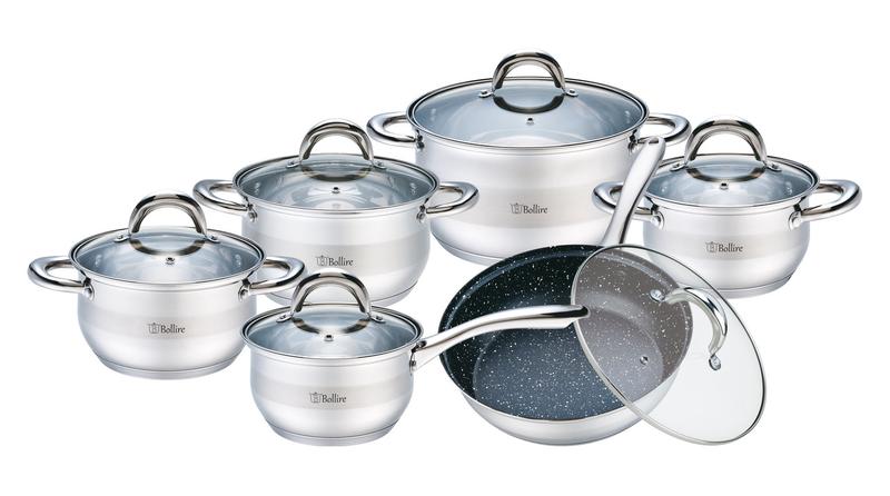 Набор посуды BOLLIRE SALERNO В наборе 1 ковш, 1 сковорода, 4 кастрюли и 6 крышек. Материал: нержавеющая сталь AISI 201. Крышки: жаропрочное стекло с пароотведением. Ручки: металлические, крепления на заклепках. Пятислойное энергосберегающее капсульное дно, толщина 5 мм. Толщина стенок – 0.5мм. Сковороды с мраморным покрытием. Размеры: ковш с крышкой – 16х9,5 см, объем – 1.6.л; сковорода с крышкой – 24х6.5 см, объем 2.4 л; кастрюля с крышкой – 16х10 см, объем 1.7 л; кастрюля с крышкой – 18х11 см, объем 2.4 л; кастрюля с крышкой 20х12 см 3.3 л; кастрюля с крышкой 2414 см, объем 5.8 л