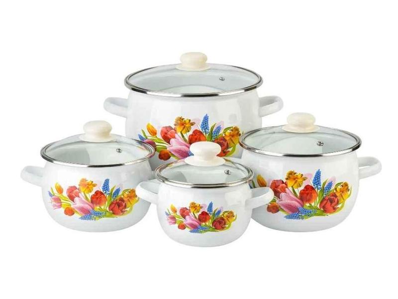 Кастрюли сферические со стеклянной крышкой 1,5 л - 1шт, 2,5 л - 1шт, 3,5 л - 1шт, 5 л - 1 шт • Для производства используется сырье европейских производителей. • Подходит для всех видов плит. Эмалированная посуда может использоваться для приготовления и хранения любых блюд на всех видах плит (обычных газовых, керамических, электрических и индукционных).