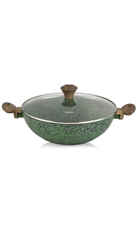 Вок Fissman Malachite из литого алюминия с двумя ручками. Диаметр 30см. Теплораспределительные свойства алюминия усилены антипригарным покрытием. Покрытие EcoStone экологично и безопасно для здоровья и окружающей среды. Нанесено в несколько слоев с содержанием натуральных каменных частиц. Вок можно использовать с минимальным количеством масла, что снижает выделение канцерогенов и обеспечивает максимально здоровую пищу. Дно утолщенное, быстро принимает и распределяет тепло. Подходит для использования на всех типах плит, включая индукционные и стеклокерамические. Две бакелитовые ручки стилизованы под дерево. В комплекте стеклянная жаропрочная крышка с металлическим ободком, пароотводом и бакелитовой ручкой. Высота стенок 9см; длина ручек 7см, диаметр дна 19см. Можно мыть в посудомоечной машине. Оригинальный дизайн в малахитовом зеленом цвете освежит кухонный интерьер. Упакован в фирменную коробку.