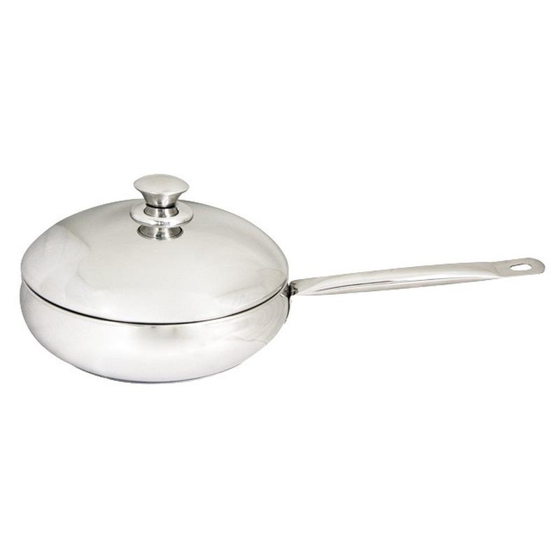Пательня виготовлена з нержавіючої сталі, 18/10. Ці цифри позначають відсотки вмісту хрому і нікелю. Обидва ці метали надають сталі корозійної стійкості, але нікель також робить її міцніше і надає їй характерного блиску. Такий посуд гарантує практично повну відсутність хімічних реакцій з їжею за будь-яких температур. Пательня має оригінальний дизайн, відрізняється ергономічністю. Дно складається з трьох шарів – два шари нержавіючої сталі і один шар алюмінію між ними. Це сприяє швидшому і більш рівномірному нагріванню їжі. Сковорідка підходить для газових, електричних, склокерамічних, індукційних плит. Її можна мити в посудомийній машині. Антипригарне покриття відсутнє. Кришка в комплекті.