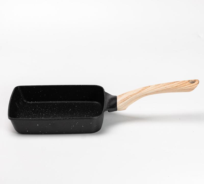 Сковорода тамагояки с антипригарным покрытием 18,5*15*3,8 см, черный Японская сковорода для омлета тамаго - незаменимый инструмент для любителей готовить многослойные скрученные омлеты, спринг-роллы и другие блюда японской кухни с минимальным количеством масла. Прямоугольная форма и антипригарное покрытие позволяют легко скатывать яичную смесь в идеальный рулетик, а скошенный бортик дает возможность без проблем переложить готовый тамагояки на тарелку. Сковорода изготовлена из алюминиевого сплава, быстро разогревается и равномерно проводит тепло, благодаря чему ее можно использовать также для яичницы, стейков, бекона и много другого. Сковорода для омлета имеет безопасное покрытие без PFOA, бакелитовая ручка не нагревается а эргономичная форма позволяет удобно держать ее в руке. Рекомендации по эксплуатации: 1. Сковорода предназначена для готовки на малом или среднем огне. 2. Во время работы с посудой следует использовать деревянные или силиконовые аксессуары. Категорически не рекомендуется переворачивать блюда металлическими ложками и кухонными лопатками во избежание появления царапин. 3. Сковороду следует мыть только после полного охлаждения. Для очистки от загрязнений не использовать жесткие мочалки и щетки, абразивные пасты и порошки, а также агрессивные моющие средства, содержащие кислоты и щелочи. 4. Во избежание утраты антипригарных свойств не рекомендуется мыть посуду в посудомоечной машине. При соблюдении всех правил эксплуатации сковорода прослужит вам длительное время. Характеристики: - Материал: алюминий - Материал ручки: бакелит - Тип дна: композитное двухслойное - Размер рабочей поверхности: 13.5*11.5 см - Высота бортиков: 3,8 см - Толщина стенок: 2 мм - Объем: 800 мл - Подходит для газовых и электрических плит