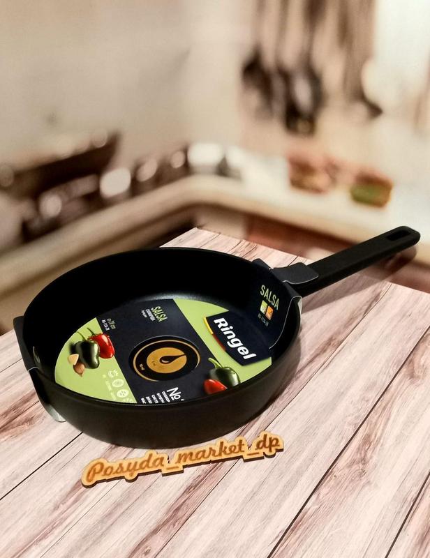 Сковорода глубокая 28 см Ringel Salsa RG-1134-28 Характеристика: Диаметр: 28 см Высота стенки: 7 см Толщина стенки: 2,6 мм Толщина дна: 4 мм Материал: кованый алюминий Материал ручки: бакелит с покрытием Soft-touch Внутреннее антипригарное покрытие: 3-х слойное антипригарное покрытие Подходит для всех типов плит, включая индукцию. Можно мыть в посудомоечной машине. Производитель: Ringel