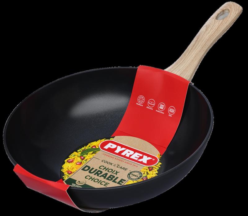 Сковорода PYREX Cook&Care WOK 28см індукція б/кришки (CR28BW6/8044) - Сковорода Cook&Care - Діаметр: 28 см - Товщина дна: мм - Матеріал: алюміній - Наявність кришки: немає Сковорідки та каструлі Pyrex з антипригарним покриттям - це найкращі друзі для щоденної кулінарії. Легкий алюміній і нержавіюча сталь швидко нагріваються і добре розподіляють тепло. Pyrex подбали про ергономіку, стиль і екологічність. Pyrex Cook&Care - це серія посуду, яка поєднує в собі турботу про ваше здоров'я та навколишнє середовище. Зроблений з переробленого алюмінію, він має міцне керамічне покриття Sol-Gel, що не містить шкідливих PFAS. У 2 рази стійкіший до подряпин і зношування ніж звичайні покриття. Cook&Care підходить для всіх типів плит, включаючи індукційні. Особливості: - Матеріал - зі 100% переробленого та придатного для вторинної переробки алюмінію - Товщина дна: мм - Керамічне антипригарне покриття Sol-Gel, не містить PFAS - Внутрішнє покриття підвищеної стійкості - Ручка: бакеліт з ефектом дерева - Рівномірне приготування їжі - Сумісність з усіма плитами, включаючи індукційні Відкрийте для себе світ кулінарних можливостей зі сковорідками та каструлями Pyrex! Кожна господиня оцінить їхню неймовірну універсальність і вражаючу довговічність. Ці зручні помічники стануть незамінними на вашій кухні, полегшуючи приготування улюблених страв. Посуд Pyrex - вибір практичних господинь.