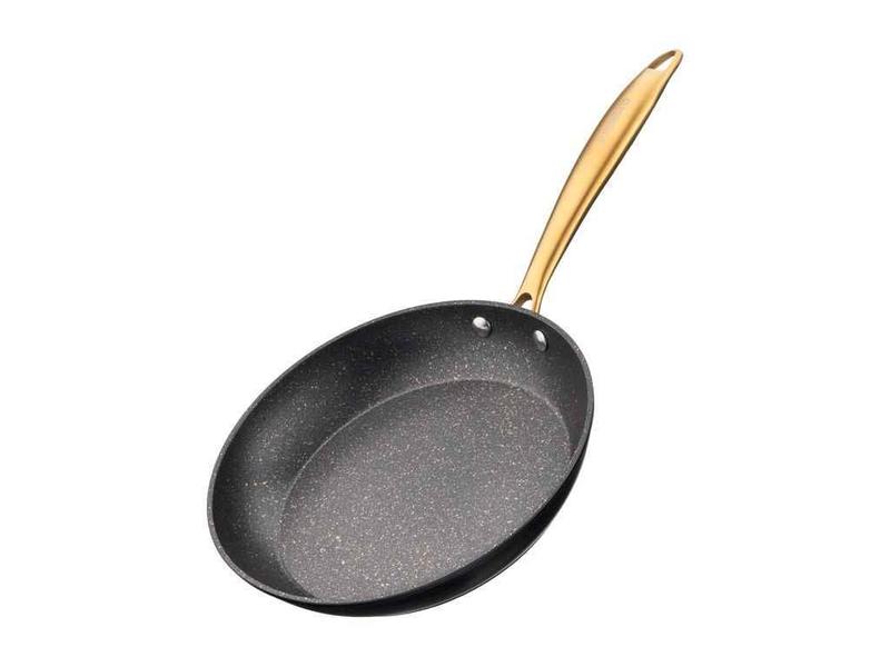 Матеріал: кований алюміній Колір: чорний Матеріал ручки: нержавіюча сталь. Колір ручки: золотистий Антипригарне покриття: Golden Marble, Pfluon, мармурове, 2 шари Висота стінок, см: 4.5 Діаметр, см: 24. Діаметр дна: 19,2 см Товщина стінок, мм: 2.5 Товщина дна, мм: 2.6. В комплекті: підставка під гаряче/протектор для зберігання; матеріал: фетр. Колір: чорний. Очищення в посудомийній машині: так Сумісність з плитами: газові, електричні, склокерамічні, галогенні, індукційні Країна виробник: Китай Гарантія: 1 місяць у разі виробничого дефекту