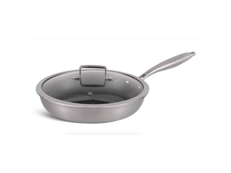Сковорода Нержавеющая Сталь С Стеклянной Крышкой Размер: Ø20 см.; Высота 4.5 см. Объем 1.0 Лтр. Черное Тефлоновое Покрытие Корпус Состоит Из Трех Слоев: Внутренний — 304 Текстурированная Нержавеющая Сталь С Устойчивым К Царапинам Антипригарным Покрытием Средний — Алюминий Для Лучшего Распределения Температуры Наружный — Нержавеющая Сталь С Магнитными Свойствами Дно Меняет Цвет При Оптимальном Разогреве, Ручка Не Греется, Можно Подвешивать, Возможно Использование Металлических Кухонных Принадлежностей Подходит Ко Всем Типам Плит, Включая Индукцию Возможно Использовать В Духовке До 260° С Возможно Мыть В Посудомоечной Машине