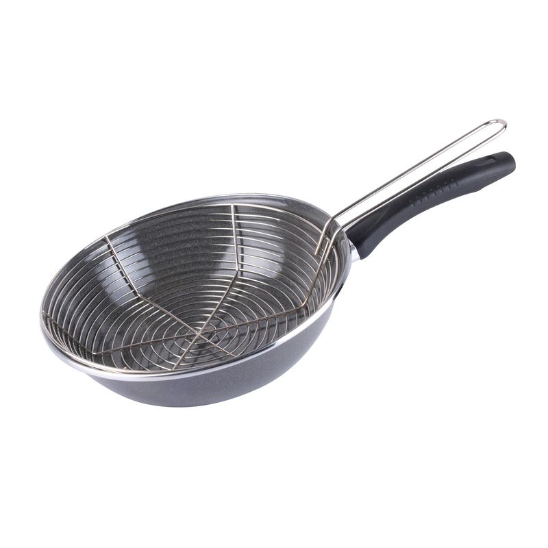 Сковорода-фритюрниця BLACK з кошиком, 26 см. Товщина корпусу з покриттям – 3 мм. Грати з нержавіючої сталі. Матеріал: Емальована сталь, загартована за 820ºC. внутрішнє покриття: двошарове посилене антипригарне покриття Quantum 2 Whitford. Зовнішнє покриття: двошарова емаль. Ергономічна бакелітова ручка. Підходить для газових, електричних, керамічних та індукційних плит. Наявність кришки: ні.