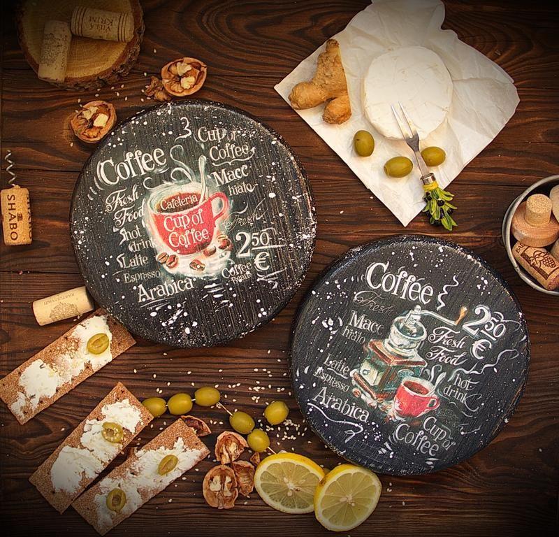 Набор из 2-х сервировочных сырных досок. Их можно использовать для оригинальной и красивой подачи закусок к обеду, званому ужину или завтраку. Также доски подойдут для украшения и дополнения кухонного интерьера или как подставки под бокал вина, например. В подарок и просто так. Досочки толстые, толщина 3,3 см. Выполнены в технике декупаж с брашированием, состарены. Все материалы,использованные в работе, на водной основе, экологичны и безопасны для здоровья. Размер 20 см в диаметре