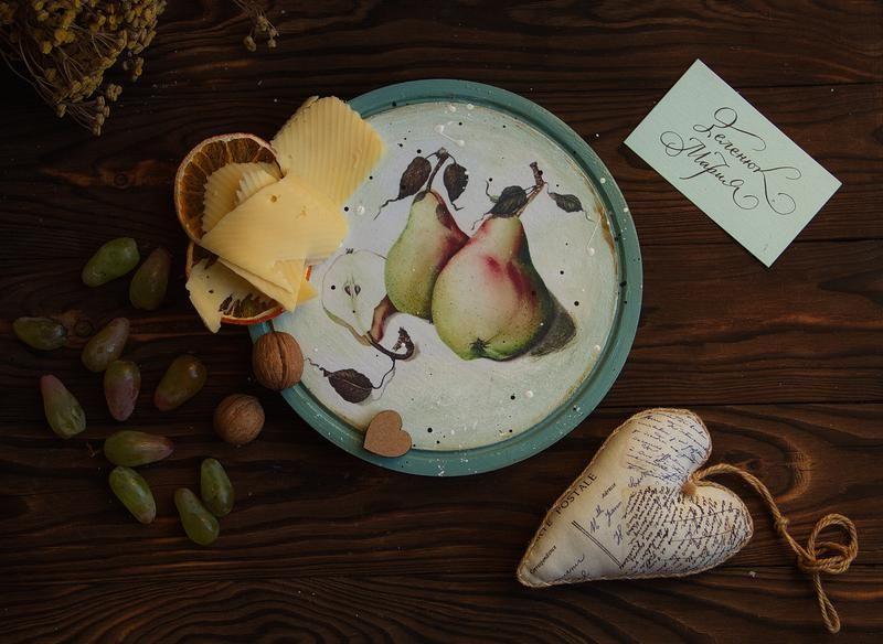 Красавица доска-тарелочка диаметром 21 см в свободной продаже. Это сервировочная двусторонняя доска- тарелка создана не для нарезки, а только для красивой подачи закусок к столу. Полюбилась мне эта работа, надеюсь, полюбится и Вам