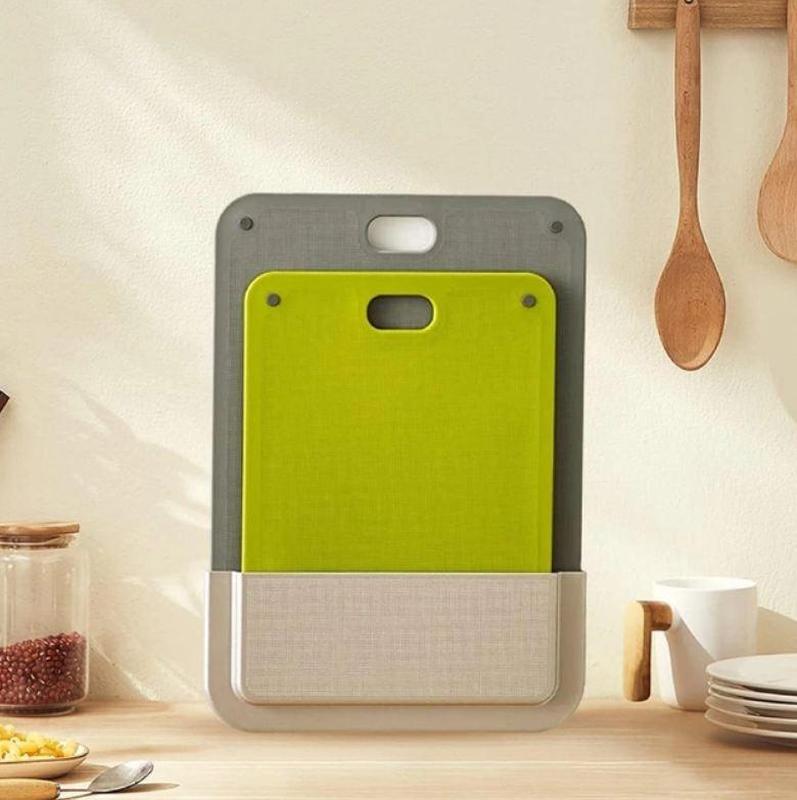 Набор из 2 разделочных досок для нарезки фруктов и овощей с настенной подставкой для кухни Happy Home MC-IO52 Набор досок для нарезки - это универсальный и практичный набор кухонных аксессуаров, разработанный для удобного и эффективного нарезания различных продуктов. Этот набор включает в себя несколько разноцветных досок, изготовленных из высококачественного и безопасного материала, что делает их идеальными для кулинарных задач. Каждая доска предназначена для нарезки определенных типов продуктов, таких как овощи, фрукты, мясо, рыба и многое другое. Каждая доска имеет свой размер и цветовое обозначение, что упрощает идентификацию и предотвращает перекрестное загрязнение продуктов. Преимущества: - Гигиеничность: Доски изготовлены из специального материала, который не тускнеет ножи и не впитывает запахи продуктов, обеспечивая максимальную гигиеничность во время приготовления пищи. - Цветная кодировка: Цветовая кодировка помогает избежать переноса вкусов и ароматов между разными продуктами и предотвращает перенос бактерий с одной доски на другую. - Кейс для хранения: В комплекте поставляется кейс, который идеально крепится на внутреннюю сторону дверцы кухонного шкафа и другие поверхности, что облегчает хранение и доступ к доскам. - Двухсторонние доски: Доски имеют две стороны для нарезки, что позволяет использовать их более эффективно и экономично. - Текстурная поверхность: Наличие текстурной поверхности на досках предотвращает скольжение продуктов и помогает скрывать следы от ножа, обеспечивая безопасное и точное нарезание. - Простая установка: Установка подставки и кейса производится без использования инструментов благодаря высокопрочной клейкой ленте 3M VHB, что обеспечивает надежное крепление. Характеристики: - Размеры: 31 х 24,5 х 2 см - Материал досок: пищевой пластик - Материал кармана: нержавейка. - Цвет: серый, зеленый - Можно мыть в посудомоечной машине Комплектация: - 2 разделочные доски - подставка