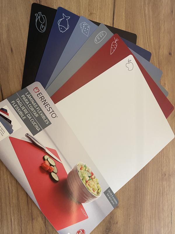 Набор гибких разделочных досок Ernesto. 6 шт. Размер: 38 x 28 см. Шикарное качество Германия. -Окреме доски для рыбы, мяса, фруктов, овощей, хлеба, сыра и колбасы. -Для каждого вида пищи у вас есть отдельная доска: так вы поддерживаете гигиену на своей кухне. - Изготовлено из гибкого пластика. Позволяет легко переложить измельченные продукты в миску или сковороду. -Низкая сторона ковриков противоскользящая. -Не повреждает лезвия ножей. -Также можно использовать как подкладку под тарелки. -Легко чистить. Не содержит BPA: без бисфенола A Цена за 1 уп. В 1 уп - 6 шт.