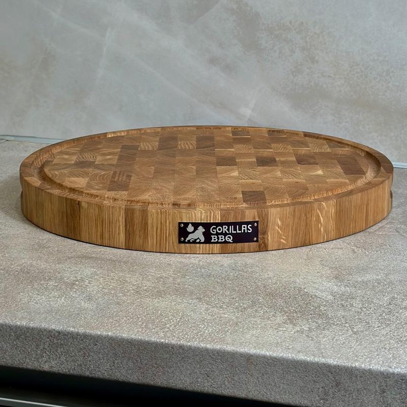 Дошка дерев'яна кругла обробна торцева діаметр 400 мм Характеристики: Матеріал - дуб Діаметр - 400 мм Обробка дошки - масло вазелінове вищого очищення, гіпоалергенне, без запаху, кольору і смаку Виробник - Gorillas BBQ