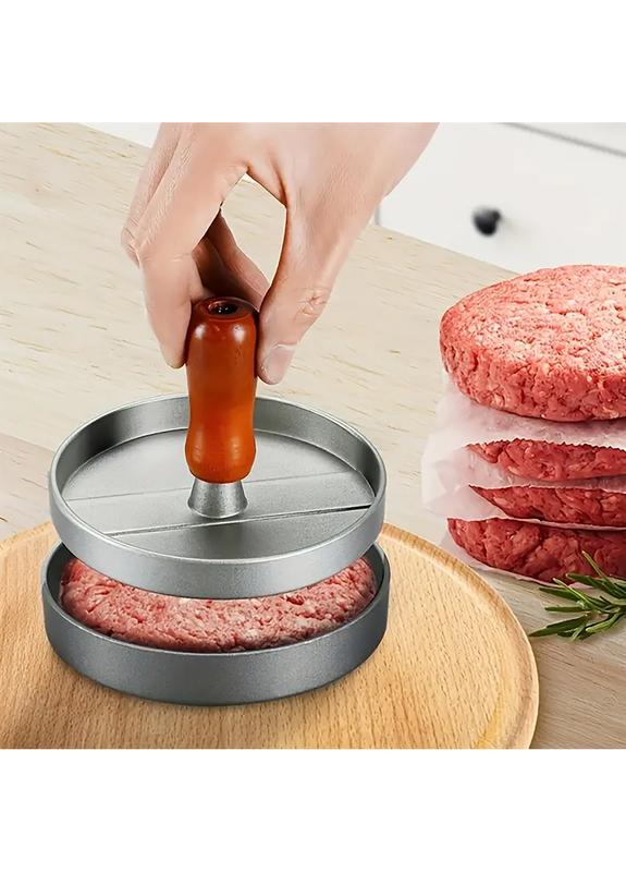 Пресс для бургеров – это удобное и практичное приспособление, которое поможет быстро и аккуратно сформировать котлеты одинакового размера и формы. С его помощью можно приготовить вкусные домашние бургеры, котлеты для гриля, бифштексы или стейки из любого типа фарша. Корпус пресса изготовлен из прочного металла с антипригарным покрытием, что предотвращает прилипание фарша и облегчает уход за изделием. Благодаря рифленой поверхности котлеты равномерно прожариваются с обеих сторон, сохраняя сочность внутри и аппетитную корочку снаружи. Деревянная ручка удобно ложится в руку, обеспечивая комфорт во время использования. Конструкция простая и надежная, не требует усилий в уходе и занимает минимум места на кухне. Пресс идеально подойдет для домашнего приготовления бургеров, а также станет полезным аксессуаром для пикников, барбекю и выездов на природу. Преимущества: Прочная металлическая конструкция с антипригарным покрытием. Удобная деревянная ручка. Легкость в использовании и чистке. Формирует котлеты одинакового размера и толщины. Подходит для фарша из мяса, птицы, рыбы или овощей. Рифленая поверхность обеспечивает равномерное прожарки. Характеристики: Тип: пресс для гамбургеров Форма: кругла Диаметр рабочей части: 11.5 см Высота пресса: 1.5 см Высота с ручкой: 8 см Материал: металл (алюминий) Покрытие: антипригарное Ручка: деревянная Цвет: серебристый Вага нетто: 134 г Вес брутто: 158 г Размер упаковки: 12 × 12.5 × 3.8 см