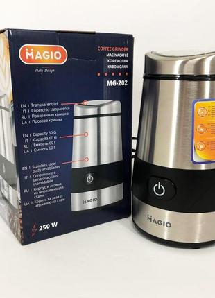 Кофемолка Magio МG-202 за один раз измельчает 60 грамм кофе. Этого вам будет достаточно, чтобы наслаждаться в кругу семьи или близких друзей ароматом свежего кофе каждый день. Особенности модели: - Мощность: 250 Вт; - Объем: 60 г; - Материал ножа и корпуса: нержавеющая сталь; - Прозрачная крышка; - Система безопасности -- эксплуатация возможна только с закрытой крышкой; - Отсек для хранения шнура; НАШ ТОВАР покликаний зробити ваш дім функціональним та стильними,ми пропонуємо великий вибір для будь-якого бюджету НАШ СЕРВІС відрізняється особливою увагою до деталей: від допомоги у виборі до підтримки після покупки НАШ МАГАЗИН пропонує не тільки широкий асортимент, але й постійні новинки,що відповідають сучасним тенденціям