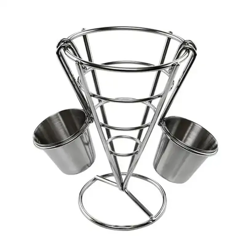 Конусная корзина для картофеля фри с соусниками - стильный и практичный аксессуар для подачи горячих закусок. Благодаря своей форме он удобно удерживает картофель фри, сохраняя ее хрустящей, а специальные отделения обеспечивают легкий доступ к соусникам. Корзина изготовлена из нержавеющей стали, что гарантирует ее прочность, долговечность и простоту в уходе. Его размер ( 15*15*13.5 см) позволяет подать оптимальную порцию картофеля вместе с несколькими соусами. Такой аксессуар станет отличным дополнением для заведений общественного питания или домашних вечеринок, делая подачу блюд еще более эффектной. Характеристики: Материал: нержавеющая сталь Размер: 15*15*13.5 см Форма: конусная Особенности: 2 соусника