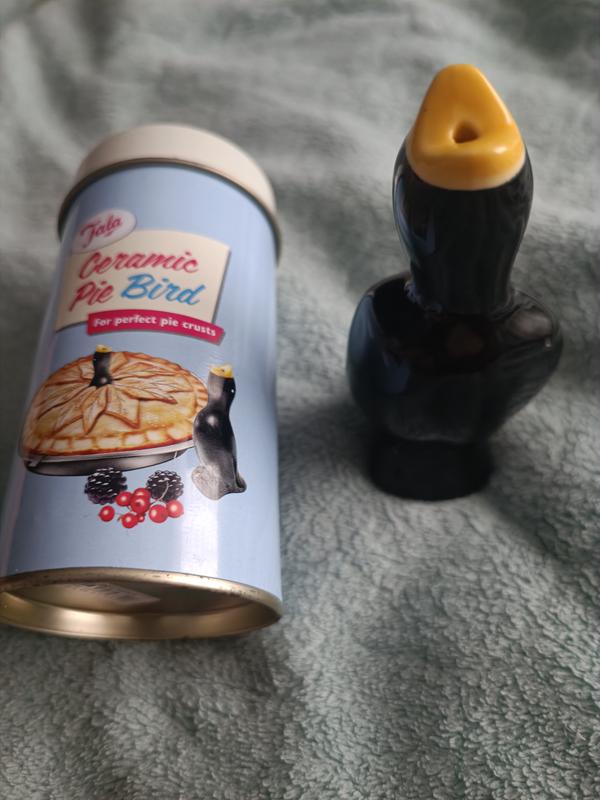это керамическая воронка для пирога (также известная как "птичка для пирога") от бренда Tala. Она используется для выпуска пара во время выпечки, что помогает сохранить корочку хрустящей и предотвращает выкипание начинки. Название продукта: Керамическая воронка для пирога Tala (Tala Ceramic Pie Bird). Назначение: Вентилирует пар из начинки пирога во время выпечки, предотвращая размокание нижней корочки. Материал: Изготовлена из прочной керамики. Особенности: Поставляется в жестяной банке для хранения с ретро-дизайном. Уход: Подходит для использования в духовке, посудомоечной машине, холодильнике и морозильной камере.