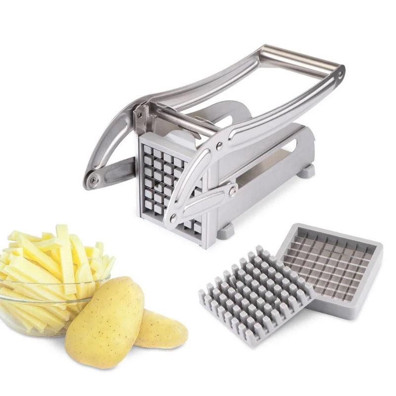 Картофелерезка – представляет собой компактный и удобный современный прибор для резки картофеля фри, который значительно сокращает время нарезания продукта. Данное устройство позволяет красиво и ровно нарезать необходимое количество картофеля или любых других овощей и фруктов. В конструкции используются ножи из высококачественной стали, которые обеспечивают хорошую и легкую производительность нарезки. Potato Chipper позволяет самостоятельно регулировать величину нарезаемых ломтиков при помощи двух сменных насадок. Картофелерезка с насадками — превосходный подарок любителям хрустящего картофеля фри. Картофелерезка прекрасно справится с задачей нарезки не только картофеля, но и других овощей и фруктов на одинаковые равномерные ломтики. В комплекте сменные ножи-решетки из нержавеющей стали разных размеров. В основании картофелерезки имеется резиновая ножка с вакуумной присоской, предотвращающей скольжение на рабочей поверхности. Благодаря этому, использование картофелерезки не составит особого труда. Если Вы любитель картошки фри, но не любите ее нарезать обычным ножом, тогда на помощь к Вам придет удобная, не занимающая много места картофелерезка. Изделие снабжено двумя ножами с различной величиной решётки, которые нарезают малые и большие ломтики. Резиновые ножки-опоры надёжно фиксирует устройство на рабочей поверхности. Рычаг с большим плечом не заставит прилагать больших усилий. Приспособление для нарезки картофеля фри позволяет быстро и аккуратно нарезать необходимое количество картофеля фри и овощей для рагу. Характеристики: материал лезвий: нержавеющая сталь; материал корпуса: нержавеющая сталь; подходит для картофеля, овощей или фруктов; в комплекте две насадки. Размеры насадок для резки картофеля: Размер ячеек 9 мм и 12 мм. Ножи изготовлены из нержавеющей стали.