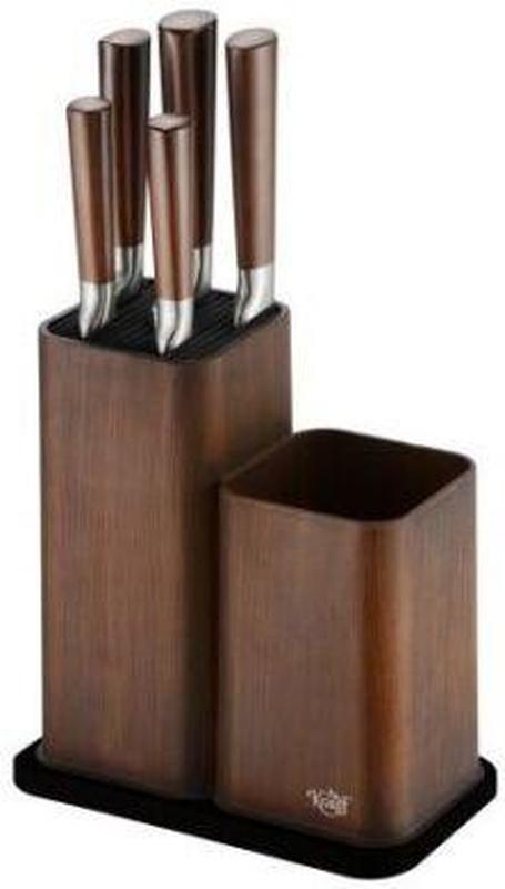 Бренд: Krauff Страна-производитель: Германия Основные характеристики Krauff .Выд набора: с подставкой Материал лезвия: нержавеющая сталь Материал ручки: бакелит Размер и вес Длина: 22,8 см Ширина: 12,3 см Высота: 38 см Комплектация Количество предметов: 6 Комплектация: нож поварской 33,5 см; нож слайсерный 33,5 см; нож для хлеба 33,5 см; нож универсальный 25 см; нож для овощей 21 см; подставка Дополнительная информация Цвет производителя: коричневый Характеристики и комплектация могут быть изменены производителем