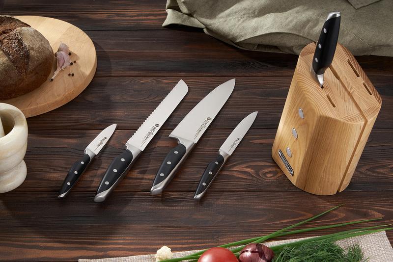 Для получения консультации вы можете связаться с нашими менеджерами по телефону +38********** или +38********** . Производитель: Grossman Вид ножа: для нарезки и разделкио Марка стали: 1.4116 Твердость стали, HRC: 55-56 Длина лезвия, мм: 200 Масса колоды без упаковки, гр: 2400 Вид упаковки: цветная картонная коробка Состав набора: 1. Шеф-нож 2. Хлебный нож 3. Нож для очистки овощей 4. Нож для нарезки мяса 5. Универсальный нож Преимущества набора: Hopewell - полный и окончательный набор качественных ножей для вашей кухни на долгие годы. - Высокое качество ножей гарантировано. Ведь они изготовлены из отменной нержавеющей стали марки 1.4116 произведённой немецкой компанией TussenKrupp AG. - Оригинальный дизайн сочетается в этих ножах с прочностью и надёжностью. Стальной хвостовик клинка идёт во всю длину рукояти. Конструкцию крепче придумать, пожалуй, невозможно. - Подставка изготовлена из качественного натурального дерева удобна. Её открытая конструкция позволяет увидеть, какой именно нож где находится. Вам не придётся угадывать, что экономит время и очень удобно. К тому же, внутри такой подставки не будет скапливаться стекающая с клинков вода. Клинки ножей изготовлены из нержавеющей стали марки 1.4116 от немецкой компании TussenKrupp AG. Эта сталь прочна, она не ржавеет, не покрывается пятнами. Ножи из нее можно заточить остро, и остроту эту они сохранят надолго. Именно поэтому нержавеющую сталь 1.4116 используют для изготовления ножей и медицинского инструмента по всей Европе. Подставка выполнена из качественного натурального дерева. Все ножи будут надёжно храниться в специально отведённом для них месте. Дренажные отверстия в дне подставки обеспечивают защиту стальных клинков от воздействия влаги. Шеф-нож: этот нож - неотъемлемая часть любого европейского кухонного набора. Потому что он и есть - главное орудие труда настоящего шеф-повара. Нет работы, с которой он не справится. Есть работы для которых лучше подойдут специальные ножи. Кстати, они тоже есть в наборе. Нож для нарезки мяса: этот, немного похожий на меч, нож отлично справляется с нарезкой ровными аккуратными ломтиками мяса, колбасы, ветчины, балыка непринужденно и в одно движение. Кстати, арбузы и дыни этим длинным острым ножом резать тоже очень удобно. Универсальный нож: на кухне всегда найдется работа для которой шеф будет великоват. То есть, шеф-ножом можно нарезать действительно все. Но зачем?Особенно если под рукой есть такой удобный и маневреный нож. Если вы купите этот набор, такой нож у вас тоже будет. Нож для нарезки хлеба: при нарезке хлеба тоже случаются свои неприятности. То хлеб очень мягок и воздушен и, вместо того, чтобы нарезаться, мнётся и рвётся. То хрустящая корочка некрасиво трескается и рассыпается вокруг крошками. Именно поэтому у ножа для нарезки хлеба такой клинок. Зубцы позволят аккуратно распилить хлеб, не повредив его. А его длины хватает даже на самый большой каравай или пирог. Нож для очистки овощей: этот небольшой нож идеально подходит для таких кропотливых и аккуратных работ, как очистка от кожуры, удаление сердцевины фруктов и нарезка их тонкими ломтиками. Больше товара здесть, переходите по ссылке: ************************************************