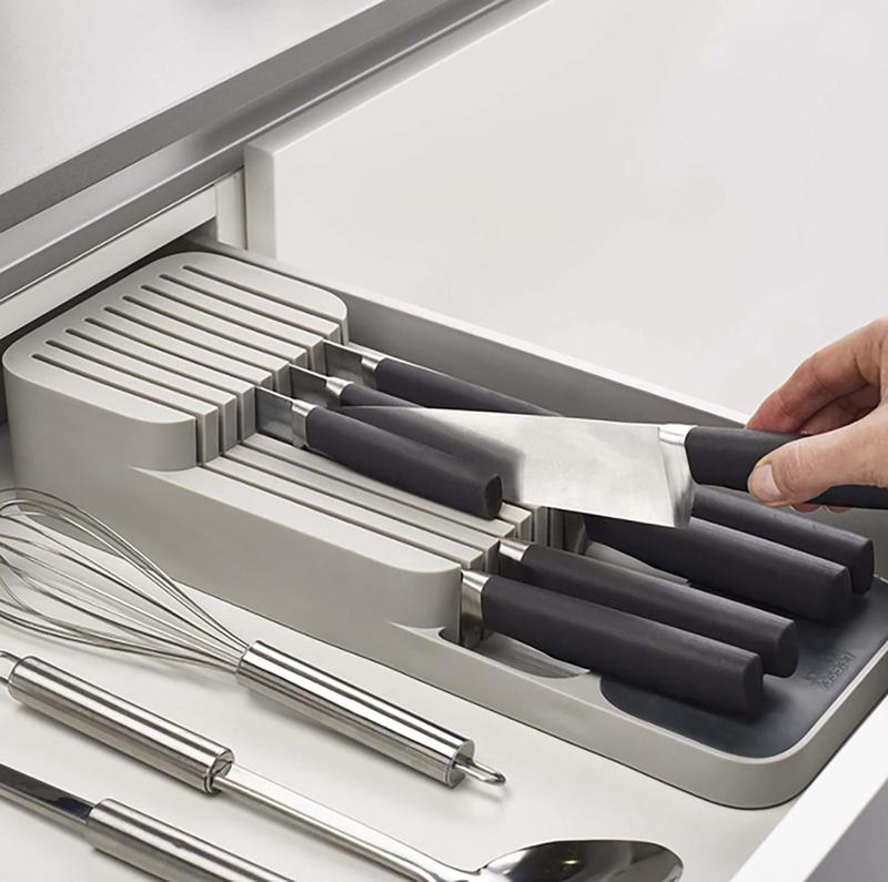 Этот кухонный органайзер DrawerStore представляет собой инновационное решение для хранения ножей, обеспечивающее максимальную экономию пространства и удобство использования. Он идеально подходит для любой современной кухни благодаря своему современному дизайну и функциональности. Основные характеристики: 1. Инновационный дизайн: Этот уникальный органайзер создает дополнительное пространство в вашем ящике, позволяя удобно хранить ножи различных размеров и форм. 2. Экономия пространства: Специально разработанный отсек для укладки позволяет хранить ножи разных типов, включая короткие фруктовые и овощные ножи, а также длинные разделочные и универсальные ножи. 3. Красивый внешний вид: Эстетичный и современный дизайн органайзера гармонично вписывается в интерьер любой кухни. 4. Широкий спектр применения: Органайзер подходит для большинства выдвижных ящиков с минимальной высотой 8 см. 5. Подходит для различных ножей: Органайзер идеально подходит для хранения ножей с лезвиями разной длины, включая длинные ножи до 23 см. 6. Легкость в уходе: Органайзер легко мыть вручную, и он быстро сохнет, что делает его удобным в повседневной эксплуатации. Дополнительные особенности: - Изготовлен из пищевого полипропилена, обеспечивая долговечность и безопасность при контакте с пищевыми продуктами. - Многослойная конструкция упрощает хранение и обеспечивает легкий доступ к ножам. - Простой и практичный дизайн, с противоскользящим основанием, обеспечивает стабильность и безопасность при использовании. Характеристики Материал: пищевой полипропилен Тип: подставка Количество вмещаемых предметов: 9 Положение ножей: горизонтальное Размеры: 39.5х14х7 см Размеры в упаковке: 39х14.5х7.5 см Вес: 295 г Мытье в посудомоечной машине: да Страна-производитель товара: Китай