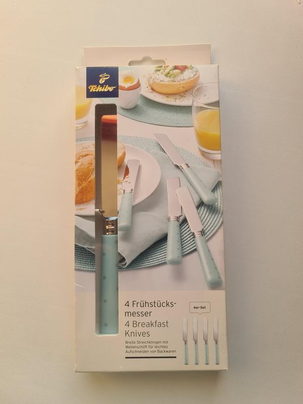 Набір ножів для сніданку Tchibo 4 штуки. Широкі леза з хвилястим заточуванням для зручного розрізання хлібобулочних виробів. Леза з нержавіючої сталі. Загальна довжина приблизно 22 см.