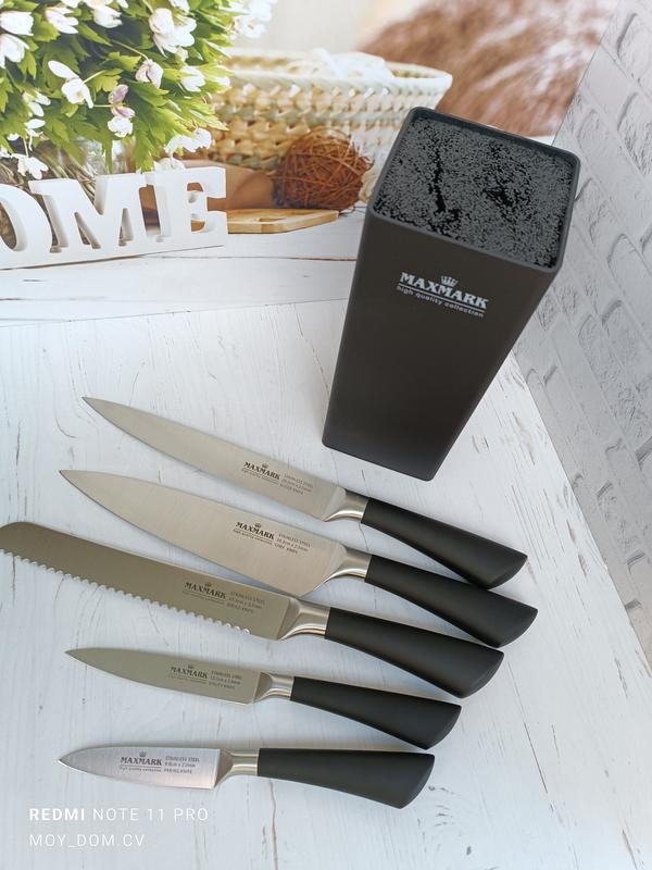 Набір ножів з 10 предметів Maxmark MK-K010 виробляється в сучасному дизайні та служить для створення максимального комфорту користувачеві. У нього входять 5 ножів різної довжини та профілю. Ножеві леза виготовлені з харчової нержавіючої сталі, міцної та довговічної. Зберігається набір ножів Maxmark MK-K010 на підставці з круглою основою. Всі вироби на підставці легко доступні, а для їх миття можна скористатися посудомийною машиною.