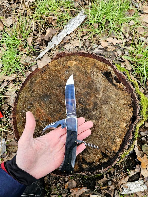 Производитель: Grand Way Вид ножа: Сложной Общая длина, мм: 220 Длина лезвия, мм: 95 Длина рукояти, мм: 125 Толщина лезвия, мм: 2.9 Ширина лезвия, мм: 23 Марка стали: 440 C Твердость стали, HRC: 57-58 Поверхность лезвия: Mirror Polish Материал рукоятки: Металл, Черное дерево Наличие клипсы: нет Тип замка: Back Lock Наличие чехла: нет Масса, г: 227 Вид упаковки: цветная картонная коробка Классический складной многофункциональный нож. Помимо своей основной функции, нож может выполнять функции консервного ножа и штопора. Рукоять ножа выполнена с применением деревянных и стальных накладок. Древесина прошла специальную обработку, устойчива к влаге, гниению и вредителям. Темный палисандр великолепно сочетается с холодным блеском полированного клинка. Помимо этого, красивая деревянная рукоять несет и чисто функциональную нагрузку - зимой такая рукоять не холодит руки. Клинок выполнен из стали 440С, очень популярного ножевого материала. Ножи из стали 440С отлично режут и долго не тупятся. Эта сталь несколько сложна в заточке, такие ножи плохо правятся мусатом и придется потратить немало сил, чтобы переточить такой клинок, но благодаря ее износостойкости. делать это придется намного реже, чем в случае использования более дешевых сталей. Нож оснащен замком Back Lock, одним из самых первых и известных замков, который иногда называют «позвоночник» за характерную металлическую часть замка, идущую вдоль всей «спины» рукояти ножа. Структура замка проста, но в тоже время очень надёжна. Тот самый «позвоночник» одновременно выполняет роль кнопки замка и стопора лезвия в открытом состоянии. Рычаг-коромысло проходит вдоль всей рукоятки и зацепляется специальным крючком за прорезь в «пятке» лезвия. Роль пружины выполняет тонкая пластина внутри рукояти. Крупный классический многофункциональный нож, с клинком из отличной стали станет Вам надежным подспорьем на природе и в быту, а также выступит замечательным подарком.