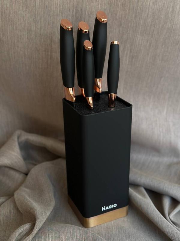 У комплект входить: Нож шеф-повара, (длина, см/толщина, мм)20/1,52 Нож для хлеба (длина, см/толщина, мм)20/1,58 Слайсерный нож (длина, см/толщина, мм)20/1,57 Универсальный нож (длина, см/толщина, мм)13/1,25 Нож для овощей, (длина, см/толщина, мм) 9/1,27 Подставка Характеристики: Тип набора: С подставкой Материал лезвия: Нержавеющая сталь Количество предметов, шт: 6 Тип ножей: Нож для овощей, Нож для хлеба, Нож шеф-повара, Слайсерный нож, Универсальный нож Материал подставки: Пластик Материал ручек: Силикон Soft Touch Цвет лезвия: Черный Вага, м: 707 Можно мыть в посудомоечной машине: Нет