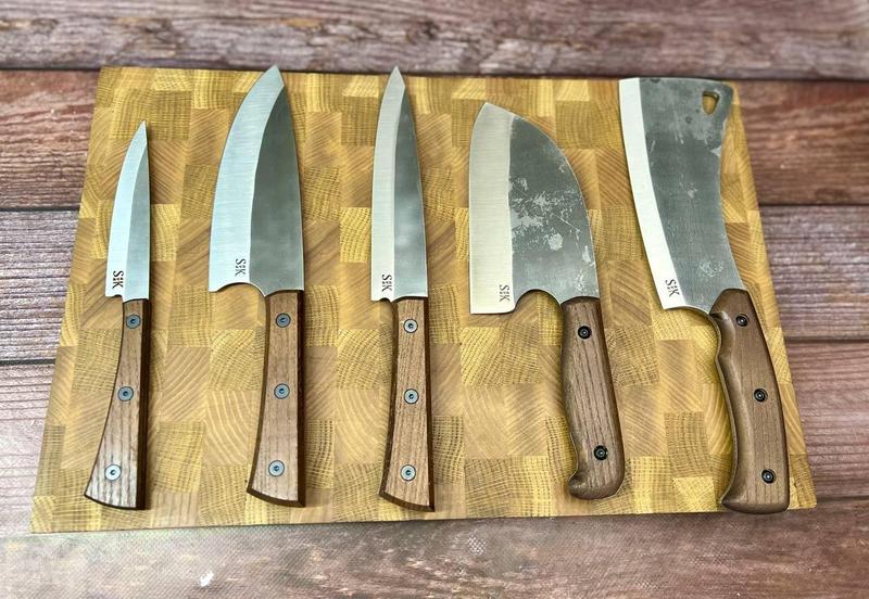 Для отримання консультації ви можете зв'язатися з нашими менеджерами по телефону +38********** або +38**********. Ручна робота Матеріал рукоятки: дерево ясен, металеві стяжки Марка сталі ножів: 1.4116 Твердість сталі ножів, HRC: 58-59 Довжина леза, мм: 170, 160, 120 та 150 Товщина леза, мм: 2,5 та 3 Ширина леза, мм: 35, 56, 25 та 80 Довжина рукояті, мм: 120, 120, 115 та 120 Загальна довжина, мм: 290, 280, 235 та 270 Марка сталі сокири: 50х14мф Твердість сталі сокири, HRC: 56 Довжина леза, мм: 170 Товщина леза, мм: 5 Ширина леза, мм: 80 край леза, 55 біля рукояті Довжина рукояті, мм: 130 Загальна довжина, мм: 300 Маса, г: 550 Вид упаковки: картонна коробка Ножі ручної роботи, зроблені в Україні. Класичний набір якісних ножів для вашої кухні. Якісна німецька нержавіюча сталь 1.4116 - запорука міцності, гостроти та довговічності кожного ножа з цього набору. Клинки ножів виготовлені із нержавіючої сталі марки 1.4116 від німецької компанії TussenKrupp AG. Ця сталь міцна, вона не іржавіє, не покривається плямами. Ножі з неї можна загострити гостро, і цю гостроту вони збережуть надовго. Саме тому нержавіючу сталь 1.4116 використовують для виготовлення ножів та медичного інструменту по всій Європі. Зведення клинка 0,2 мм виконане ручне заточування. Клинок сокири сталь 50х14мф, застосована при виготовленні сікача, відмінно підходить, оскільки вона забезпечує клинок стійкістю на злам, опірністю до зносу, довгим утриманням заточування і не вимоглива в плані якогось особливого догляду. Класичний дизайн, рукояті виконані з дерева ясен - екологічний та солідний матеріал. Ножі виглядають стильно, а їхні рукояті міцні та зручні. Набір чудово впишеться в інтер'єр сучасної європейської кухні. Рукоятки виготовлені з дерева ясен, ножі мають приємний колір. Рукоятки промаслені тунговою олією та полірована карнаубським воском та пастою. Непогано заповнюють долоню, ніде не вминає її, не намагається провернутися. Догляд: Рекомендуємо тримати ножі чистими, сухими, без залишків забруднення після використання. Більше товару тут, переходьте за посиланням: ************************************************
