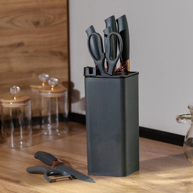 Этот набор кухонных ножей из 7 предметов станет незаменимым помощником на вашей кухне. Он обеспечивает все необходимое для приготовления пищи, от нарезания мяса и овощей до очистки фруктов и зелени. Ножи изготовлены из высококачественной нержавеющей стали, устойчивой к коррозии и повреждениям, с острыми лезвиями, которые легко режут. Удобные ручки не скользят в руке, обеспечивая комфорт во время использования. Характеристики: Материал лезвий: высококачественная нержавеющая сталь. Ручки: удобные, не скользят. Подставка: компактная, с интегрированной точилкой. Преимущества: Устойчивость к коррозии и повреждениям. Лезвия с острым резом. Интегрированное точило для поддержания остроты лезвий. Компактное размещение на подставке, что экономит место. Уход: Очистка ножей мягкими моющими средствами. Регулярное использование точилки для поддержания остроты лезвий. Набор содержит: Поварской нож Нож для хлеба Нож для мяса Универсальный нож Нож для нарезки Кухонные ножницы Овощерезка