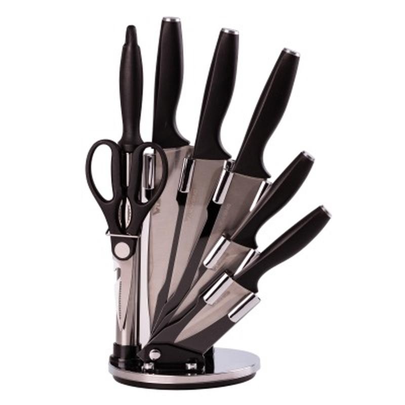 Набір кухонних ножів з нержавіючої сталі – важлива складова будь-якої кухні, яка впливає не тільки на якість готової страви, але й на безпеку в процесі приготування. Підставка не займає багато місця, ножі виготовлені зі сталі 5CR15, а лезо має алмазне заточування, яке полегшує процес обробки продуктів. Ручка виконана з високоякісного поліпропілену, відрізняється ергономічною формою та зручно "лягає" в руку. У набір входять: Кухарський ніж Ніж для хліба Ніж для м'яса Ніж для овочів Ніж для чищення Кухонні ножиці