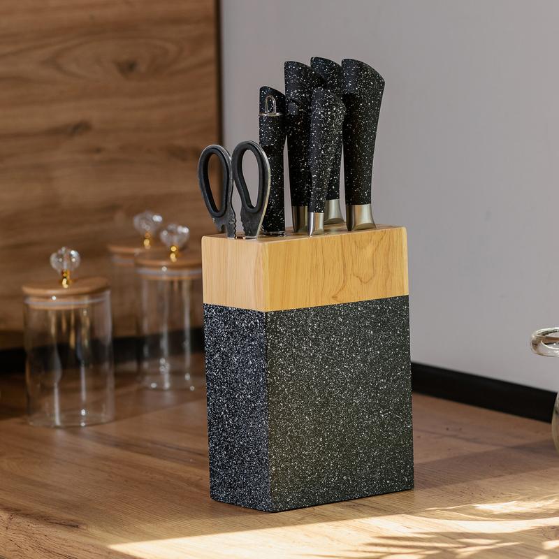 Набор кухонных ножей на подставке из 8 предметов - это удобный и практичный инструмент, который станет незаменимым на любой кухне. Набор включает 8 ножей различного назначения и удобную подставку для их хранения. Ножи изготовлены из высококачественной нержавеющей стали, которая отличается прочностью, устойчивостью к коррозии и точностью заточки. Острые и долговечные лезвия позволяют легко справляться с любыми продуктами, а подставка из дерева и пластика обеспечивает удобное и компактное хранение ножей. Характеристики: Материал лезвий: высококачественная нержавеющая сталь. Подставка: комбинация дерева и пластика, устойчивое дно, отверстия для каждого ножа. Преимущества: Устойчивость к коррозии и точность заточки. Острые и долговечные лезвия. Удобное хранение благодаря подставке с отверстиями. Уход: Очистка ножей мягкими моющими средствами. Регулярная очистка и просушивание подставки для предотвращения износа. Набор содержит: Нож универсальный Нож поварской Нож для нарезки Овощной нож Кухонные ножницы Кухонный топорик Мусат Подставка
