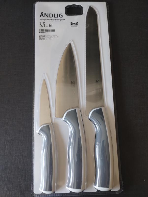 Набор высококачественных ножей от IKEA ÄNDLIG 🔪 Функциональность и удобство в каждом движении! Набор кухонных ножей Ikea Ändlig – это идеальное сочетание прочности, эргономичности и доступности. Благодаря удобной форме и прочным лезвиям вы легко будете нарезать хлеб, овощи, фрукты и мясо, обеспечивая себе комфорт во время приготовления пищи. 🔹 Основные преимущества: ✅ Острые и долговечные лезвия – легко режут любые продукты. ✅ Эргономичные ручки – обеспечивают удобный и надежный хват. ✅ Универсальный набор – для различных нужд на кухне. ✅ Легкость в уходе – простая очистка и долгий срок службы. 🔹 В комплект входят: 1️| Нож для хлеба - 23 см (общая длина 35 см). 2️| Поварской нож - 15 см (общая длина 28 см). 3️| Нож для чистки овощей - 10 см (общая длина 20 см). Цвет: светло-серый / белый Материал: нержавеющая сталь. Количество в наборе: 3 шт. ⚠ Перед первым использованием обязательно промойте ножи. ✨ Ikea Ändlig – готовьте с комфортом и легкостью!