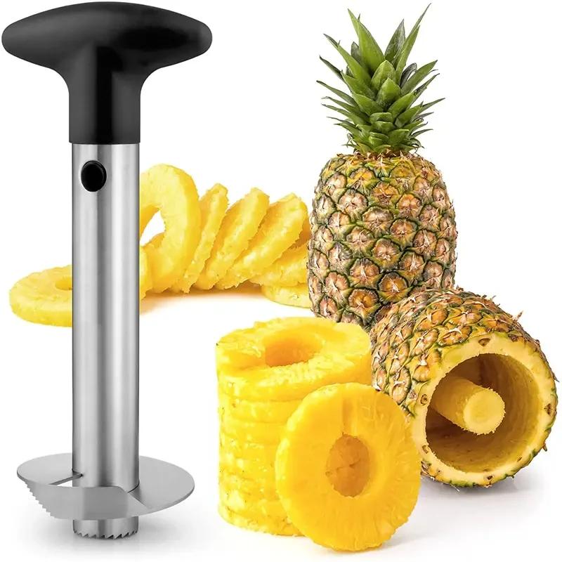 Нож для нарезки ананаса Wan Jie - ананасорезки Нож для нарезки ананасов удаляет сердцевину фрукта и нарезает свежий ананас всего за 30 секунд. При этом им очень легко пользоваться. Ананасорезка работает по принципу вкручивания нарезающего диска в ананас, не повреждает стенки ананаса, отделяя мякоть ровными кольцами, оставляя жесткую сердцевину. Один поворот ножа срезает одно кольцо,можно нарезать весь ананас сразу.Жесткая оболочка ананаса остается не поврежденной, ее можно использовать для сервировки стола или наполнить фруктовым салатом. Нож для нарезки ананасов Wan Jie сделан из полированной, нержавеющей стали. Съемная ручка выполненная из пластика, отсоединяется одним движением при помощи нажатия кнопок. Ананасорезка подойдет для нарезки ананасов весом 1,3-2,3 кг. Можно мыть в посудомоечной машине. Преимущества: -безопасный нож -сохраняет сок в ананасе ― уникальный дизайн позволяет резать как левой так и правой рукой -можно мыть в посудомоечной машине -простой в использовании