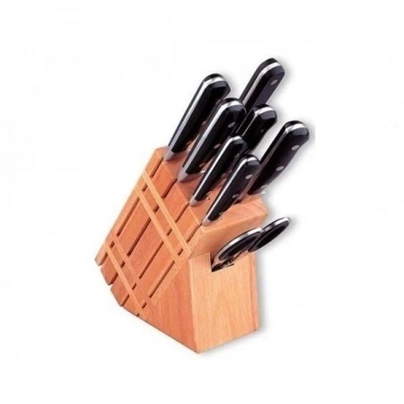 Производитель: Vinzer (Швейцария) Набор ножей Vinzer MASTER 9 предметов артикул 50111. Набор ножей Vinzer MASTER изготовлен из высокоуглеродистой стали 1.4028 / X30Cr13, благодаря чему надолго сохраняется острота лезвий. Колода выполнена из каучукового дерева. Эргономичные бакелитовые ручки. Набор включает: - нож поварской с длиной лезвия 8 дюймов (20,3 см.) и толщиной 3 мм.; - нож для мяса с длиной лезвия 8 дюймов (20,3 см.) и толщиной 3 мм.; - нож для хлеба с длиной лезвия 8 дюймов (20,3 см.) и толщиной 3 мм.; - нож разделочный с длиной лезвия 5,5 дюймов (14 см.) и толщиной 2,5 мм.; - нож универсальный с длиной лезвия 5 дюймов (12,7 см.) и толщиной 2,5 мм.; - нож для овощей с длиной лезвия 3 дюйма (7,6 см.) и толщиной 2 мм.; - мусат длиной 5 дюймов (20,3 см.) и толщиной 10 мм.; - ножницы кухонные. Можно мыть в посудомоечной машине.