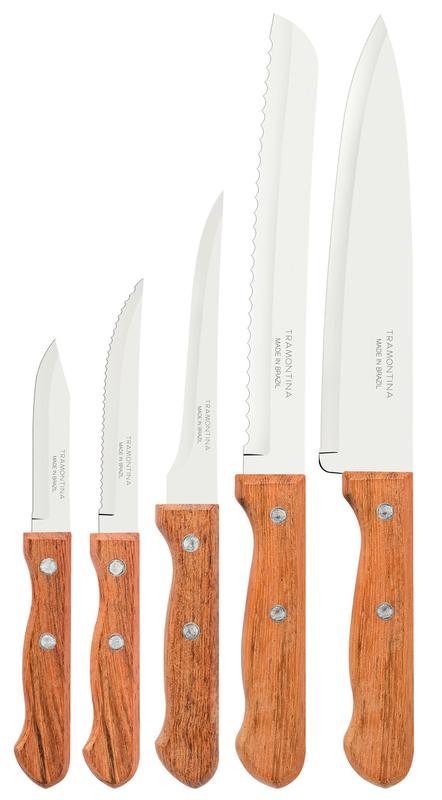 . Набір ножів Dynamic . Матеріал леза: нержавіюча сталь . Матеріал ручки: дерево . Кількість предметів: 5 Кожен виріб Tramontina розробляється з умовою, щоб він зміг задовольнити смак як звичайного домовласника, так і найбільш вибагливого професійного кухаря. Tramontina - це інноваційні розробки, сучасний дизайн, еко-технології та символ гарного смаку для всього світу. Особливості: - Матеріал леза: сталь AISI 420 (твердість 53 HRC) - Товщина леза: 1.0-1.2 мм - Матеріал руків'я: оброблене натуральне дерево JATOBA (бразильська вишня) - Рекомендується ручне миття Комплектація набору: - Ніж для овочів 1 шт. - 76 мм - Ніж для стейка 1 шт. - 102 мм - Ніж обваловувальний 1 шт. - 127 мм - Ніж ШЕФ 1 шт. - 203 мм - Ніж для хліба 1 шт. - 203 мм Tramontina - це бразильська корпорація з віковою історією, заснована в Бразилії в 1911 році. Наразі це - світовий лідер у виробництві товарів для кухні, будинку, саду. Tramontina - це бренд, представлений в 120 країнах світу, це 10 фабрик і 22 000 + одиниць продукції. Один з лідерів світового ринку з виробництва ножів, столових і кухонних аксесуарів, посуду для приготування їжі, інструментів для сільського господарства, будівництва та саду.