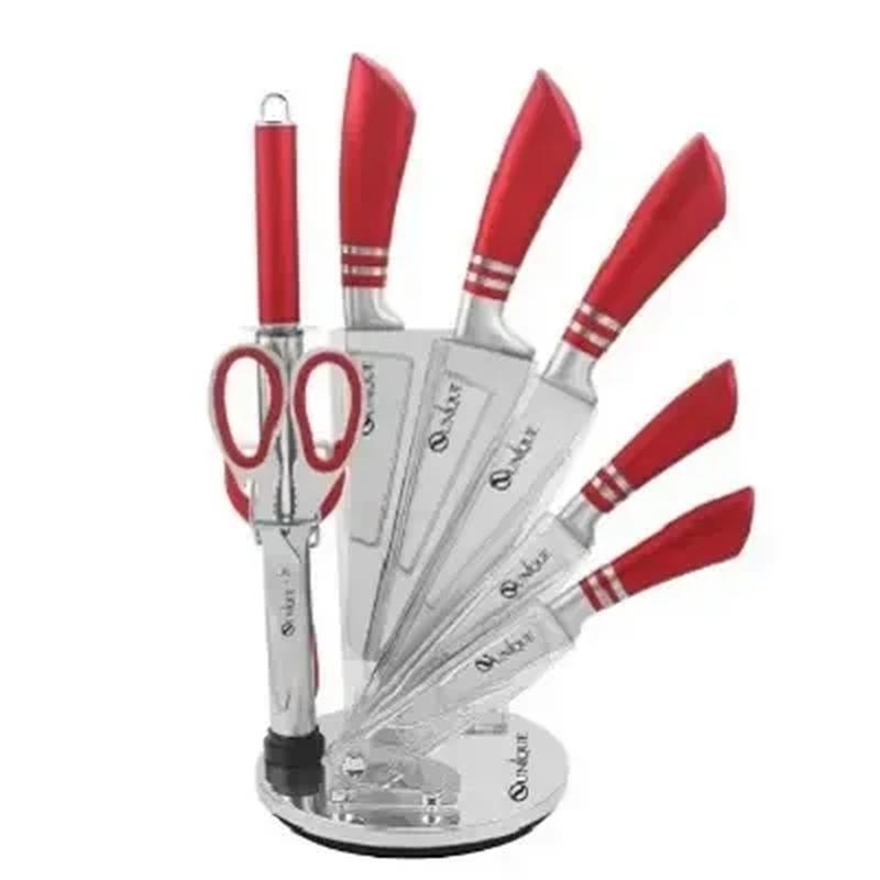 Набір ножів UNIQUE UN-1832 9 предметів За допомогою набору ножів UNIQUE UN-1832 процес приготування стає простішим, швидшим і приємнішим, адже всі знають, що гарний настрій покращує смак приготовленої їжі. Завдяки високій якості матеріалів ножів вони прослужать Вам довго та будуть надійними помічниками у побуті. Переваги Стильний дизайн Довгий термін служби Якісні матеріали Характеристики Кількість предметів у наборі: 9 Матеріал леза: нержавіюча сталь Матеріал підставки: пластик Матеріал ручки: пластик Країна виробник: Китай Комплектація Подрібнювач 7" 2,5 мм Кухарський ніж 8" 2,5 мм Ніж для хліба 8" 2,5 мм Ніж універсальний 5" 2 мм Ніж для чищення 3,5" 2 мм Ножиці 7,5" 2,5 мм Точилка 7,5" Овочечистка Підставка Заводська упаковка