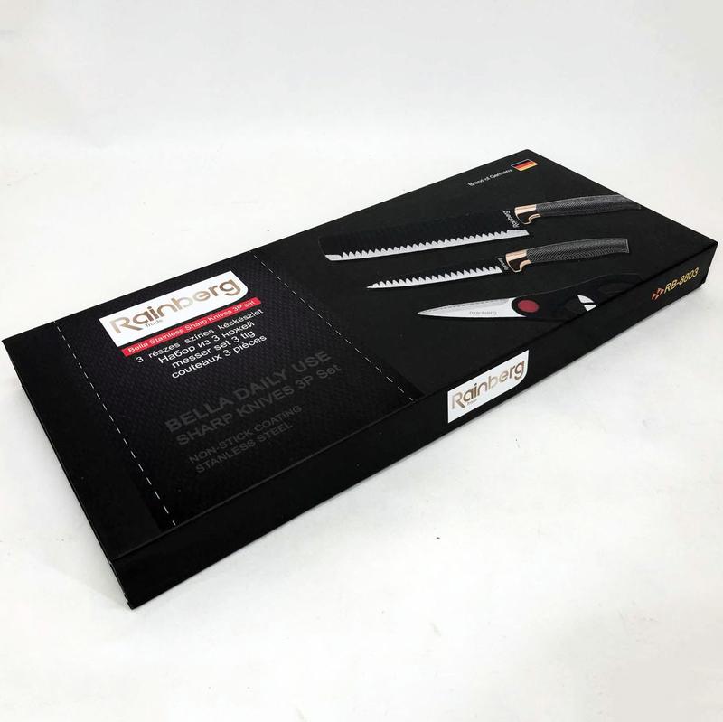 🔥 Набор литых кухонных ножей Rainberg RB-8803, Набор хороших качественных кухонных ножей XW-12 ✨ Высокость керамического покрытия: износостойкость, устойчивость к бактериям, легко моется, продукт не прилипает к лезвиям во время нарезки. ✨ Ножи имеют нековзкие ручки с вставками из силикона для удобства использования. ✨ Кухонные ножи с керамическим покрытием не требуют особого ухода, их можно мыть вручную и в посудомоечной машине. ✨ Эргономическая рукоятка из ABS-пластика, покрытая термостойким каучуком, предотвращает выпадение ножа. ✨ Нож "не боится" ни горячей воды, ни агрессивных моющих средств, которые могут повредить режущее полотно обычной стальной модели. ✨ Преимущества этого набора кухонных ножей: - ➕ Острое лезвие. - ➕ Антибактериальное и антикоррозийное покрытие, - ➕ Эргономические антикальные ручки, - ➕ Легко очищается, - ➕ Невероятное скольжение; к ножам ничего не прилипает, - ➕ Использована высокопропорциональная нержавеющая и коррозионно-стойкая сталь (высокоуглеродистая) с керамическим покрытием, ✨ Набор ножей для кухни Rainberg RB-8803 включает в себя: - ➕ Ножницы. - ➕ Нож для фруктов. - ➕ Универсальный нож; - ➕ Подарочная картонная коробка. 🔎 Дополнительные параметры - ➕ Подходит для мытья в посудомоечной машине: Да - ➕ Материал лезвия: Нержавеющая сталь - ➕ Кейс в комплекте: Да - ➕ Нож для хлеба: 1 шт. - ➕ Количество предметов в наборе: 3 - ➕ Страна производитель: Китай - ➕ Тип: Набор ножей - ➕ Производитель: Rainberg - ➕ Материал рукоятки: Пластик - ➕ Овощной нож: 1 шт. - ➕ Нож поварской: 1 шт. - ➕ Нож универсальный: 1 шт. - ➕ Нож для нарезки: 1 шт. - ➕ Ножницы кухонные: 1 шт.