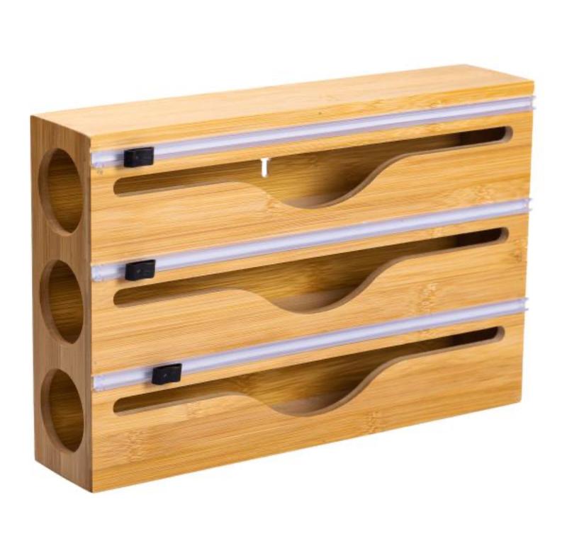 Диспенсер-держатель 2 в 1 предназначен для удобного хранения и использования пищевой пленки, фольги и пергаментной бумаги. Он оснащен тремя отсеками, что позволяет одновременно размещать различные рулоны. Длина прорези для резки составляет 29,5 см, что обеспечивает ровный и аккуратный срез материала. Диаметр отверстий 5 см, подходящий для большинства стандартных рулонов. Корпус изделия изготовлен из натурального бамбука, что придает ему прочность и долговечность. Гладкая поверхность материала облегчает уход и очищение, а естественный оттенок хорошо сочетается с интерьером кухни. Благодаря компактным размерам 33,3 × 21,8 × 7 см, диспенсер занимает минимум места и может быть установлен как на столешнице, так и закреплен на стене. Устройство оснащено встроенным резаком, который позволяет быстро и безопасно отрезать необходимую длину материала. Конструкция обеспечивает легкое вытяжение рулонов и равномерное разделение пленки или фольги без морщин и разрывов. Диспенсер подходит для использования в бытовых условиях и на профессиональных кухнях. Характеристики: Назначение: для пищевой пленки, фольги и пергаментной бумаги Количество отсеков: 3 Материал: бамбук Размеры: 33,3 × 21,8 × 7 см Длина прорези для резки: 29,5 см Диаметр отверстий: 5 см Способ установки: настольный или настенный монтаж Особенности: встроенный резак, компактный дизайн, удобное извлечение рулонов Вес: 1 кг