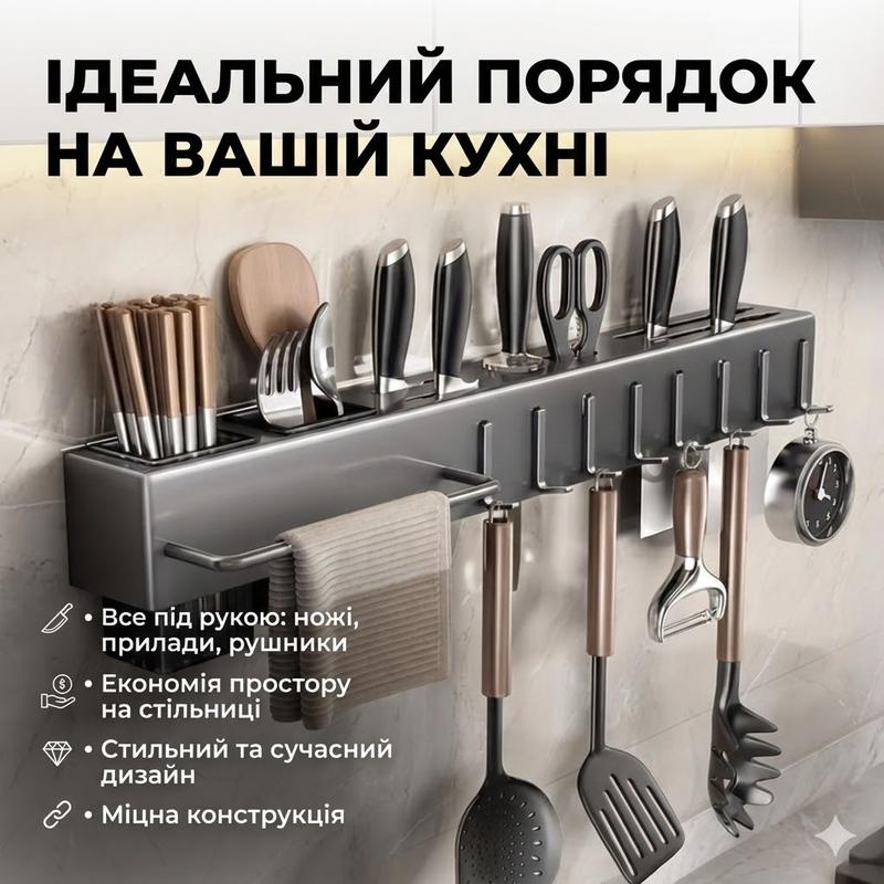 Описание товара Навесная полка-органайзер для кухни SKLM-5 (40 см) Хотите навести идеальный порядок на рабочей поверхности и держать все инструменты под рукой? Навесная полка-органайзер SKLM-5 — это стильное, компактное и практичное решение для современной кухни. Она объединяет в себе держатель для ножей, крючки для лопаток и половников, а также перекладину для кухонного полотенца, позволяя максимально эффективно использовать пространство стены. Ключевые преимущества: Многофункциональность 3в1: Заменяет сразу несколько аксессуаров — подставку для ножей, вешалку для полотенец и крючки для утвари. Экономия места: Освобождает столешницу, убирая кухонные принадлежности на стену, что особенно актуально для небольших кухонь. Продуманный дизайн: Специальные слоты надежно удерживают ножи, а подвижные крючки позволяют разместить предметы разного размера. Долговечность: Изготовлена из качественного материала, устойчивого к влаге, коррозии и кухонным загрязнениям. Стильный внешний вид: Лаконичный дизайн отлично впишется в интерьер в стиле лофт, хай-тек или классика. Технические характеристики: Тип: Настенный кухонный органайзер / вешалка. Модель: SKLM-5. Размеры (ДхШхВ): 40 х 5.5 х 7 см. Функционал: Слот для ножей, перекладина для полотенец, крючки. Материал: Металл (алюминиевый сплав). Тип установки: Настенный.