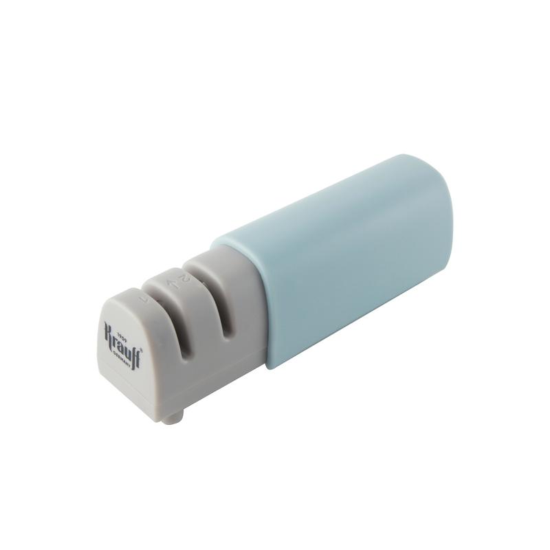 Точилка для ножів Krauff -- має двоступеневе точило, яке забезпечує надзвичайно гострі леза ножів. Перший слот точилки оснащений заточувальним механізмом з вольфрамової сталі, який повертає леза у V-подібну форму. У другому слоті розташований дрібнозернистий наждачний полірувальник. Основа точилки виготовлена з силікону, тому вона не ковзає, забезпечує надійність і стабільність в процесі використання. Ручка зроблена з міцного пластику та забезпечує зручний захват під час роботи. Точилка виконана в зеленому та сірому кольорі. Має розміри: 5х5х17,3 см.