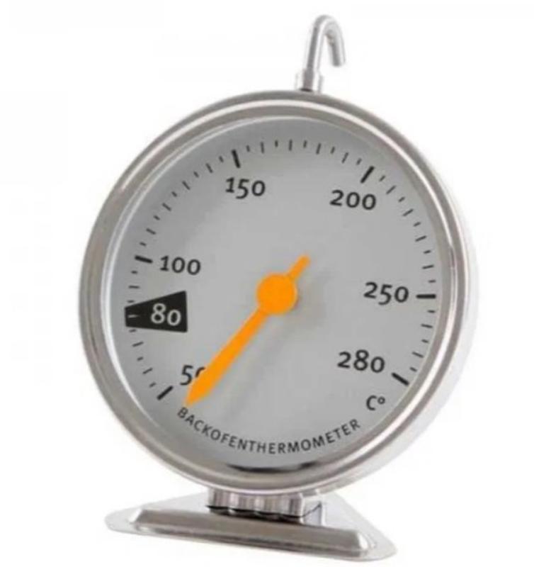 Качественный термометр для духовки, печи, гриля из нержавеющей стали. С возможностью подвешивания (оборот 360 градусов) или установки на ровную поверхность. Всегда подскажет при какой температуре вы готовите мясо, птицу, рыбу, выпечку, пиццу или рататуй. Большой диаметр циферблата: 70 мм, хорошо видно за стеклом духовки Шаг шкалы: 5 градусов Цельсия Допустимая погрешность измерения температуры: +/- 1 C. Термостойкое стекло. Имеет подставку и крючок для крепления. Технические характеристики: - механический - корпус из нержавеющей стали. - диапазон от 50 до 280 С - диаметр циферблата: 60 мм - крючок для подвешивания вращается на 360 градусов - основание равносторонний треугольник, 1 сторона 55 мм - цвет: металлик - габариты: 90 х 70 х 45 мм - масса: 52 гр