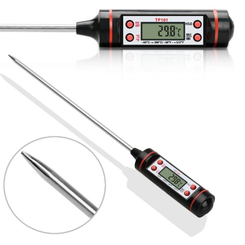 Кулинарный термометр пригодится не только профессиональным поварам, но и любой хозяйке. Чтобы добиться исключительного вкуса, бывает необходимо знать не только температуру духовки, но и самого блюда. Именно для этих целей сделан кулинарный термометр. Он имеет железное шило, которое с легкостью проникнет внутрь блюда, не повредив его. Таким термометром вам будет легко измерить температуру внутри мяса, курицы, пирога и других продуктов и даже жидкостей и сыпучих материалов. Цифровой штыковой термометр позволит быстро и точно измерить температуру внутри продуктов, готовящегося блюда, соуса или напитка. Игла изготовлена из пищевой нержавеющей стали, корпус пластиковый. Диапазон измерения от -50°С до +300°С. Дополнительно комплектуется тубусом для хранения и батарейкой ("таблетка"). Цифровой дисплей и две кнопки для переключения режима измерения в °C или °F и включения/выключения термометра. Есть функция авто-выключения при неиспользовании. Основные характеристики TP101: широкий диапазон применений; зонд датчика изготовлен из нержавеющей стали; корпус датчика изготовлен из прочной пластмассы; широкий температурный диапазон измерения: от -50 °C до +300 °C переключение между единицами измерения: °C и °F; автоматическое отключение после 10 минут без операции; пластиковый чехол тубус корпуса для хранения и обеспечения безопасности; точность задания температуры: 0,1 °C; функция запоминания последней температуры; функция просмотра максимальной и минимальной температуры при замере; электропитание: 1 батарейка LR44 на 1,5 В (в комплекте); общая длина: 23,5 см длина щупа: 14,5 см диаметр щупа: 3,5 мм габариты: 25 * 2,5 * 2,5 см Комплектация: Термометр TP101 - 1шт; Тубус для хранения - 1шт; Батарейка - 1шт; Инструкция (англ.) - 1шт;