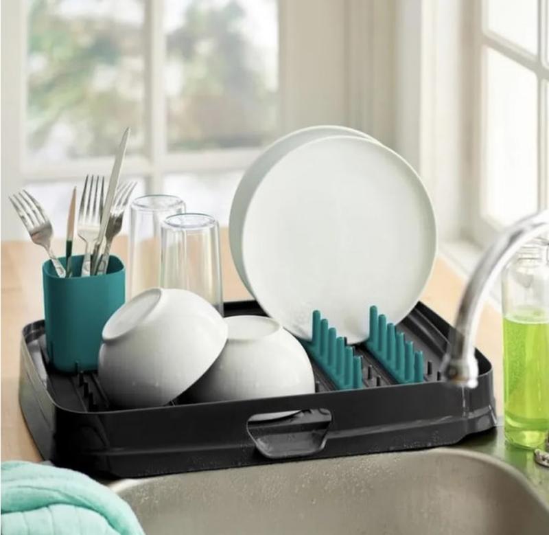 Сушилка для посуды Tupperware Сушилка для посуды поможет расставить посуду для сушки, а также позволит хранить тарелки, кружки и столовые приборы в быстром доступе. Сушилка для посуды имеет продуманный дизайн, который обеспечивает ее функциональность и привлекательность. Главной частью сушилки является основание, которое выполнено в виде наклонной плоскости и размещено под углом к поверхности стола. С верхней и нижней стороны основания установлены штыри, которые выполнены из безопасного полимера. Наклон основания позволяет воде стекать к бортику лотка. Штыри на поверхности надежно закрепляют держатель для 8 тарелок и съемный стакан для столовых приборов. Съемный стакан предназначен для надежного хранения до 24 столовых приборов и 3 кухонных ножей. Его можно установить в самых разных положениях, как на основание, так и на бортик. Остальное место с радостью займут бокалы, чашки, эко-бутылки и другая кухонная посуда. Параметры Высота 8.5 см Длина 45.7 см Ширина 36.5 см