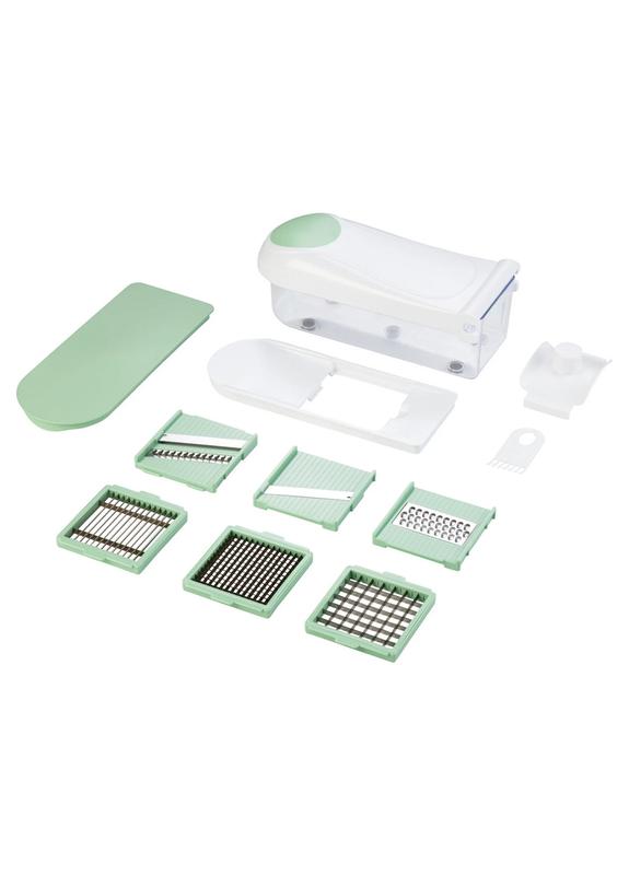 !БРАК! !ОТЛОМЛЕННОЕ КРЕПЛЕНИЕ КРЫШКИ К КОРПУСУ!!!Многофункциональная терка шинковка для ровных кубиков, жульена, ломтиков или мелкого натирания. Идеально подходит для картофеля, овощей, сырой пищи, фруктов или сыра. С 6 вставками: 2 дисковые вставки, 2 режущие решетки (большая и маленькая), терка и вставка для жульена. Очень острые лезвия из нержавеющей стали для быстрой работы. Безопасное использование благодаря держателю. Большой контейнер с противоскользящими ножками. Съемная откидная крышка с прорезиненной ручкой для надежного удержания. С крышкой для контейнера. Компактное хранение вставок в контейнере. В комплекте также щеточка для чистки. Без BPA. Можно мыть в посудомоечной машине. Материал - пластик, нержавеющая сталь. Размеры примерно 27,5х11х10,8 см. Производитель Германия.