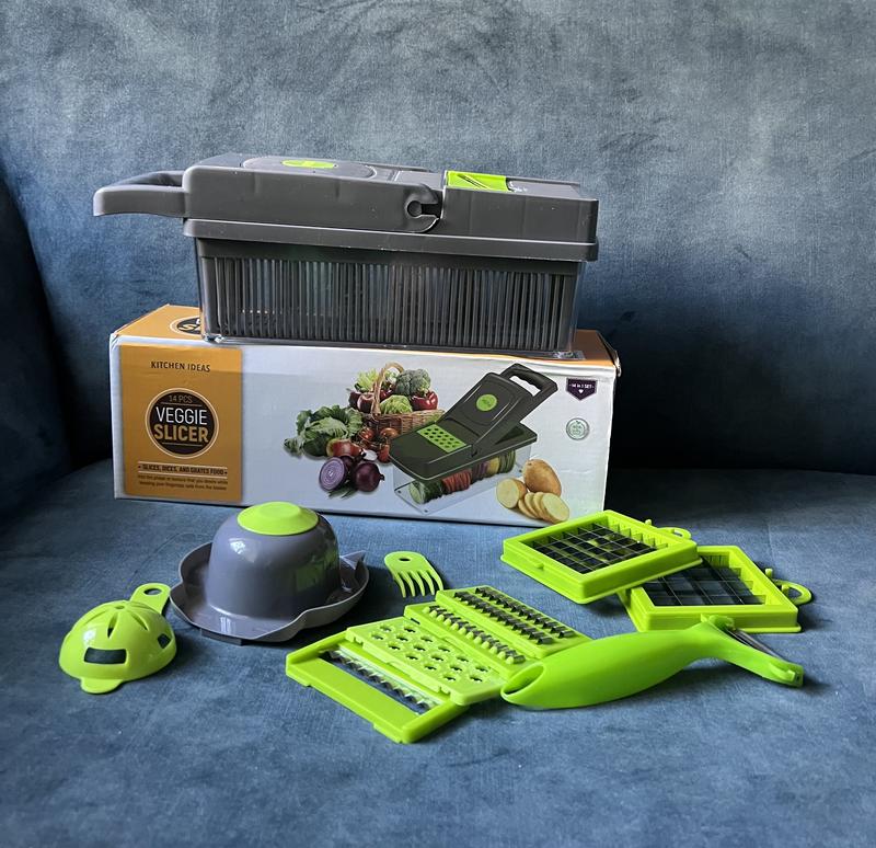 Багатофункціональна овочерізка з контейнером Зручний кухонний набір для швидкого та безпечного приготування овочів та фруктів. Ідеально підходить для шинкування, нарізки кубиками, тертки та чищення. У комплекті: • контейнер з кришкою та ручкою; • декілька змінних насадок для різних видів нарізки; • овочечистка; • тримач для безпечної нарізки; • тертка та слайсер. В чудовому стані, використовувалась декілька разів