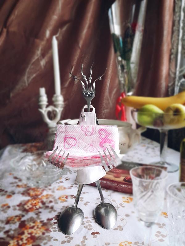Дуже незвична серветниця, зроблена з ложок та виделок у гарному фартушку, може стати гарною прикрасою для вашого столу чи оселі.