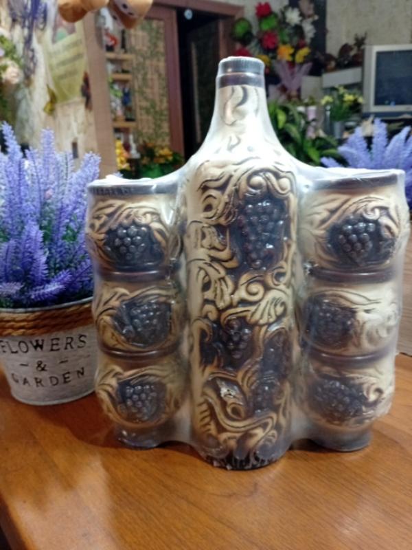 Красивый керамический набор для винных напитков, на штофе и чашках объемные узоры в виде веточек с гроздьями винограда. Можете приобрести как для себя. так и на подарок. Способ приобретения узнайте пожалуйста в переписке