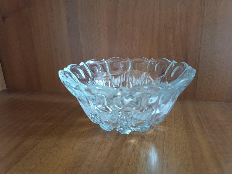 Салатник/фруктовница, хрусталь СССР, диаметр 17,5 см, высота 8см. --- 🏺 Стеклянная чаша с рельефным орнаментом Эта изящная прозрачная стеклянная чаша сочетает в себе эстетику ретро и функциональность. Ее декоративный волнистый край придает форме мягкой динамики, а рельефный узор из геометрических мотивов создает игру света и теней, что особенно эффектно смотрится при естественном освещении. 🔹 Материал: прозрачное прессованное стекло 🔹 Форма: круглая, с волнистым краем 🔹 Декор: рельефный орнамент из геометрических элементов 🔹 Назначение: для сервировки фруктов, сладостей или как декоративный элемент интерьера 🔹 Состояние: без повреждений, сохраненная прозрачность и блеск 🕰️ Чаша относится к изделиям середины XX века.