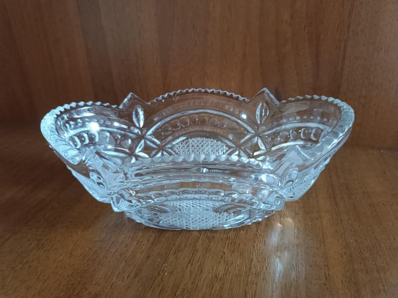 Салатник/фруктовница хрусталь, СССР. Размер : 18,8×11,5×7,5 см. --- 🏺 Изысканная стеклянная чаша с рельефным орнаментом 🔹 Материал: прозрачное прессованное стекло 🔹 Форма: овальная с волнистым краем 🔹 Отделка: - Геометрические узоры - ромбы, овалы, звездообразные мотивы - Текстурированные элементы, создающие игру света - Декоративные выступы по краю, придающие объем 🔹 Состояние: без повреждений, сохраненная прозрачность и блеск 🔹 Назначение: - Идеально для сервировки фруктов, конфет или в качестве декоративного элемента - Подходит для интерьеров в стиле ретро, винтаж, классика 🔹 Исторический контекст: Такие изделия были популярны в середине ХХ века, особенно в Восточной Европе, как часть праздничных сервизов. Их часто дарили на торжественные события, и они хранились как семейные реликвии.